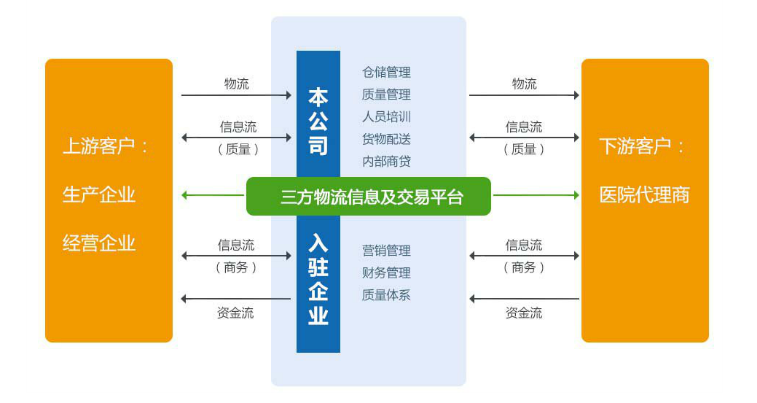 医疗器械第三方物流的商业模式为:作为专业的第三方物流提供共享仓储、配送、质量管理、标准化办公、交易支持等服务;使得新办或未达到国家强制标准的医疗器械经营企业以较低的成本取得合法资质,助力企业经营交易,推进其快速发展。医疗器械第三方物流业务模式如下图: